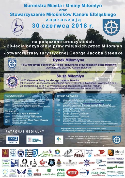 Zapraszamy na uroczyste otwarcie Trasy Turystycznej Georga Jacoba Steenke w Miłomłynie połączone z 20-leciem odzyskania praw miejskich przez Miłomłyn. Główne atrakcje imprezy: